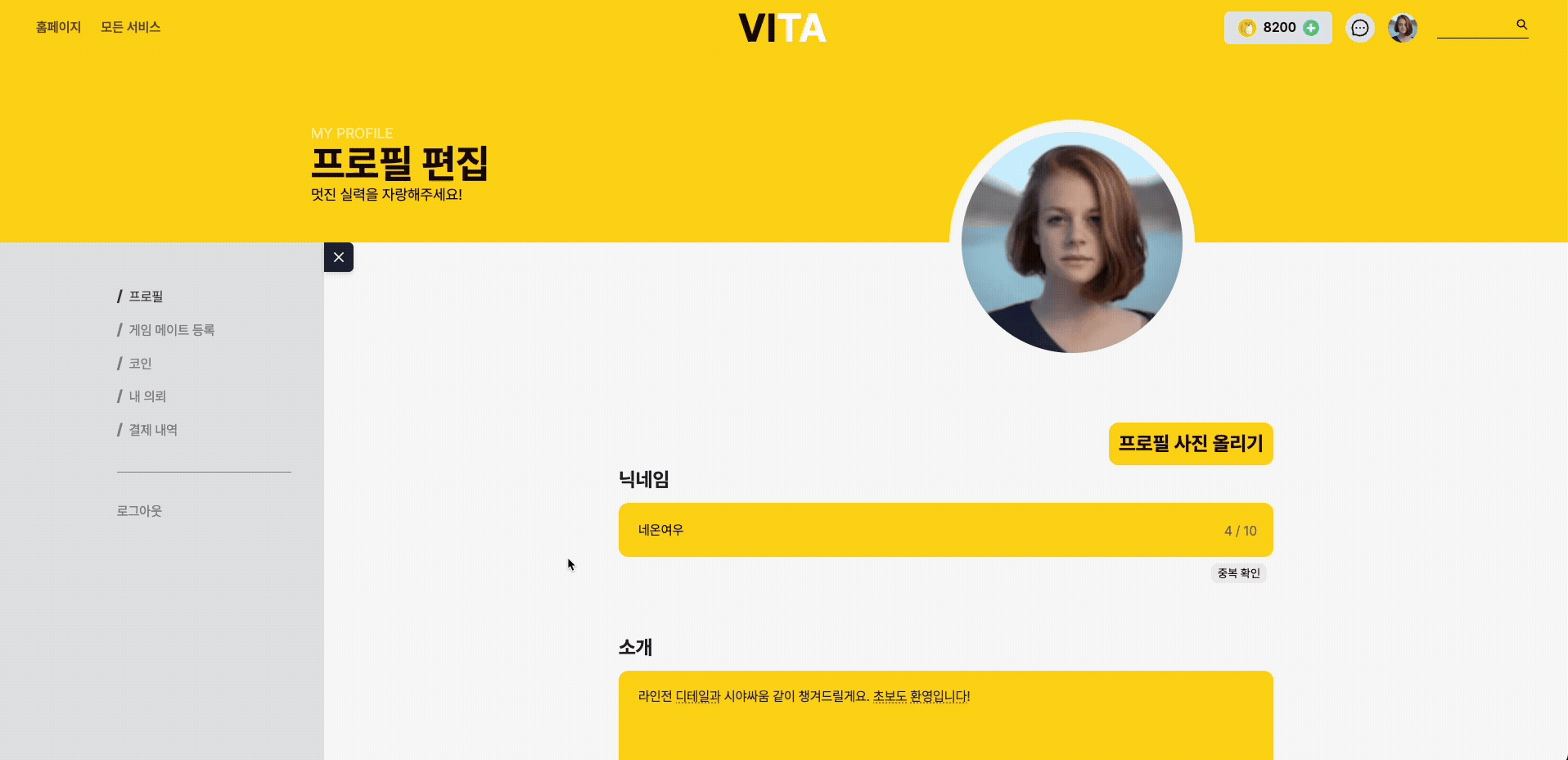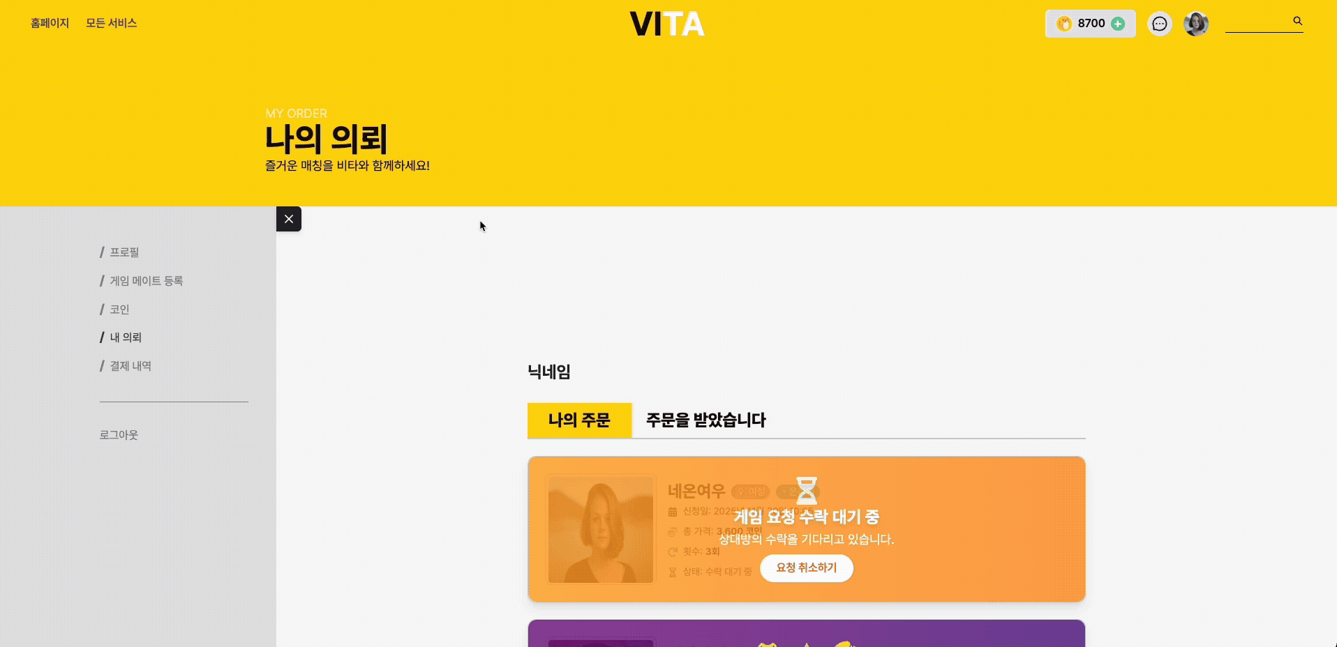 - 마이페이지 사이드바(프로필, 게임메이트 등록, 코인, 의뢰, 결제 내역, 로그아웃) 네비게이션 개발